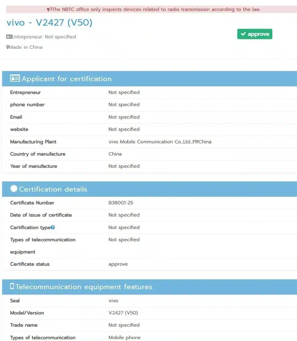 เริ่มด้วย vivo โมเดล V2427 ที่คาดว่าจะเป็น vivo V50 ได้รับรองแล้วจากกสทช. ในประเทศไทยเรียบร้อย รวมถึง V50e ที่เป็นรุ่นเล็กสุดในตระกูลนี้ก็ได้ผ่านการรับรองแล้วจาก BIS ในอินเดียครับ