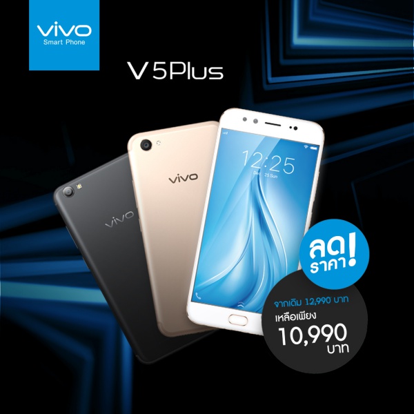 โดยทั้ง 2 สี คือ สีทอง ( Gold ) และสีดำ ( Matte Black ) จะเริ่มลดราคาตั้งแต่วันที่ 27 กรกฏาคม 2560 นี้เป็นต้นไป จาก 12,990 บาท เหลือเพียง 10,990 บาทเท่านั้น ท่านใดที่สนใจสามารถจับจองเป็นเจ้าของ Vivo V5Plus ได้แล้วที่ตัวแทนจัดจำหน่ายสมาร์ทโฟนชั้นนำทั่วประเทศ ดูรายละเอียดเพิ่มเติมได้ทาง www.vivo.com