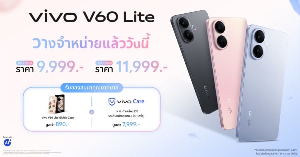 vivo V60 Lite วางจำหน่ายในตลาดประเทศไทยอย่างเป็นทางการ พร้อมให้ vivo fans ได้สัมผัสแล้วตั้งแต่วันที่ 18 ตุลาคมนี้ ที่หน้าร้าน vivo Brand Shop ทุกสาขา ช่องทางออนไลน์ และตัวแทนจำหน่ายทั่วประเทศ ใน 2 รุ่นความจุ ได้แก่ 8GB + 256GB ในราคา 9,999 บาท และ 12GB + 256GB ในราคา 11,999 บาท