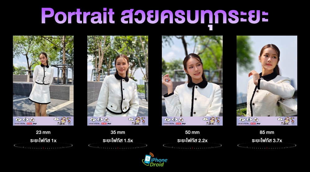 เรื่องของ Portrait ก็ยังให้เราได้ถ่ายได้สวยงามตามสไตล์ของ vivo เลยเช่นกัน สวยครบถึง 4 ระยะ ตั้งแต่ 23mm, 35mm, 50mm และ 85mm ซึ่งทั้งหมดถ่ายสวยคมชัดตั้งแต่กดถ่ายครั้งแรก รวมถึงการละลายฉากหลังก็ทำได้ดี ค่อนข้างเนียนตา และปรับระดับบิวตี้ได้ตามใจชอบด้วยครับ