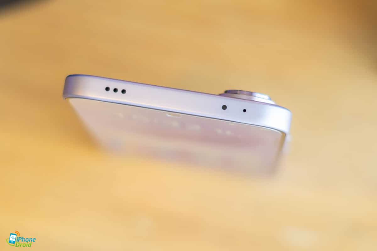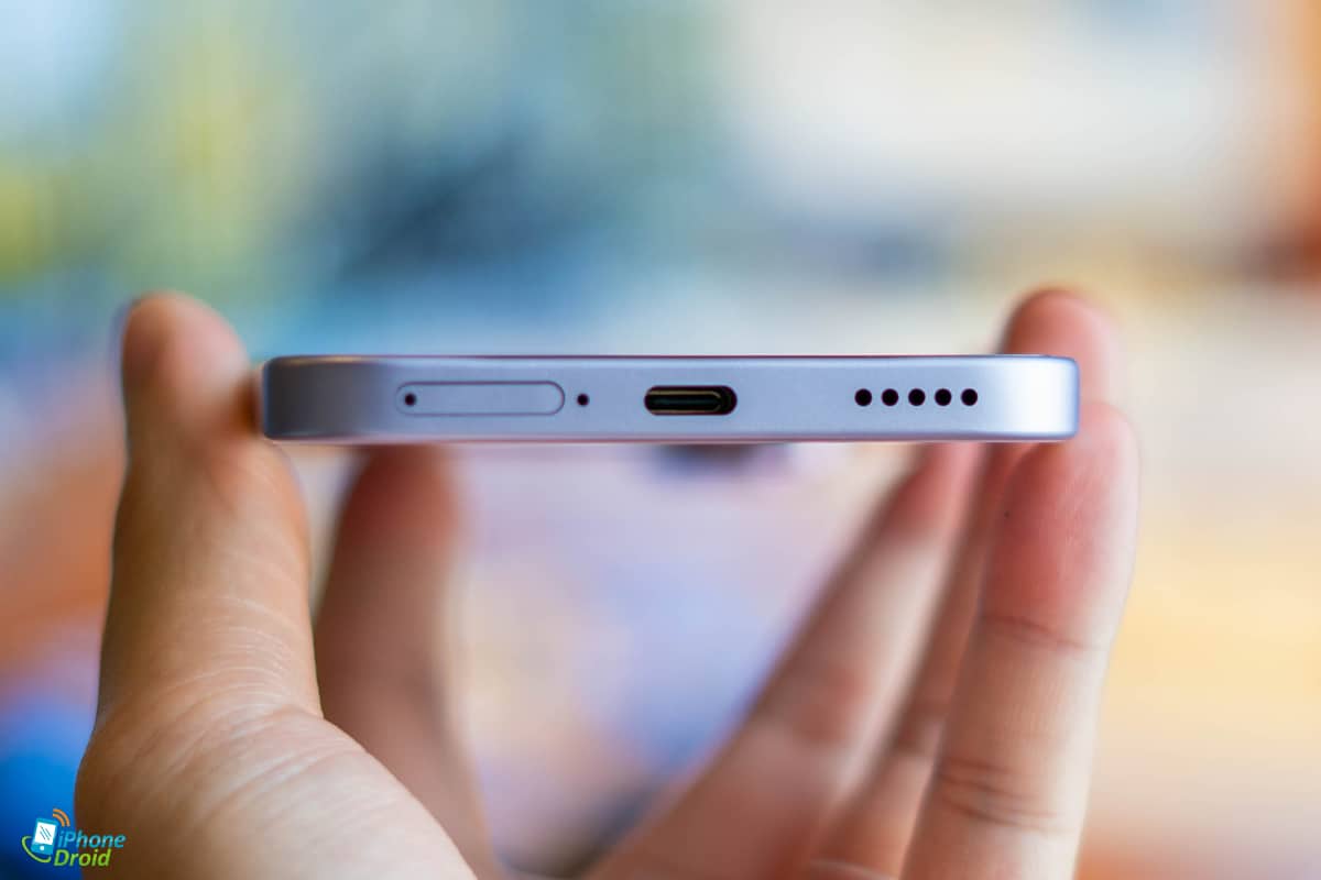 ฝั่งล่างตัวเครื่องจะเป็นช่องใส่ซิมการ์ดมาให้ 2 ช่องเลย ตามด้วยไมโครโฟนตัวหลัก พอร์ต USB-C และลำโพงสเตอริโอ