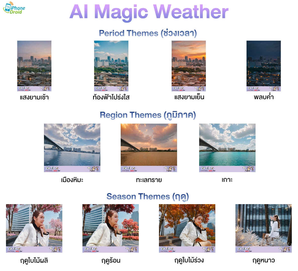 vivo V70 FE ยังมาพร้อมกับฟีเจอร์ AI Magic Weather ที่ให้เราเปลี่ยนสภาพอากาศได้หลายรูปแบบด้วย AI ที่ถูกใส่เข้ามาในรุ่นนี้ ทำให้เราได้ภาพท่องเที่ยวรูปแบบใหม่ สนุกกว่าเดิม และไม่เหมือนใครด้วย ซึ่งฟีเจอร์นี้จะมี 3 แบบ ดังนี้