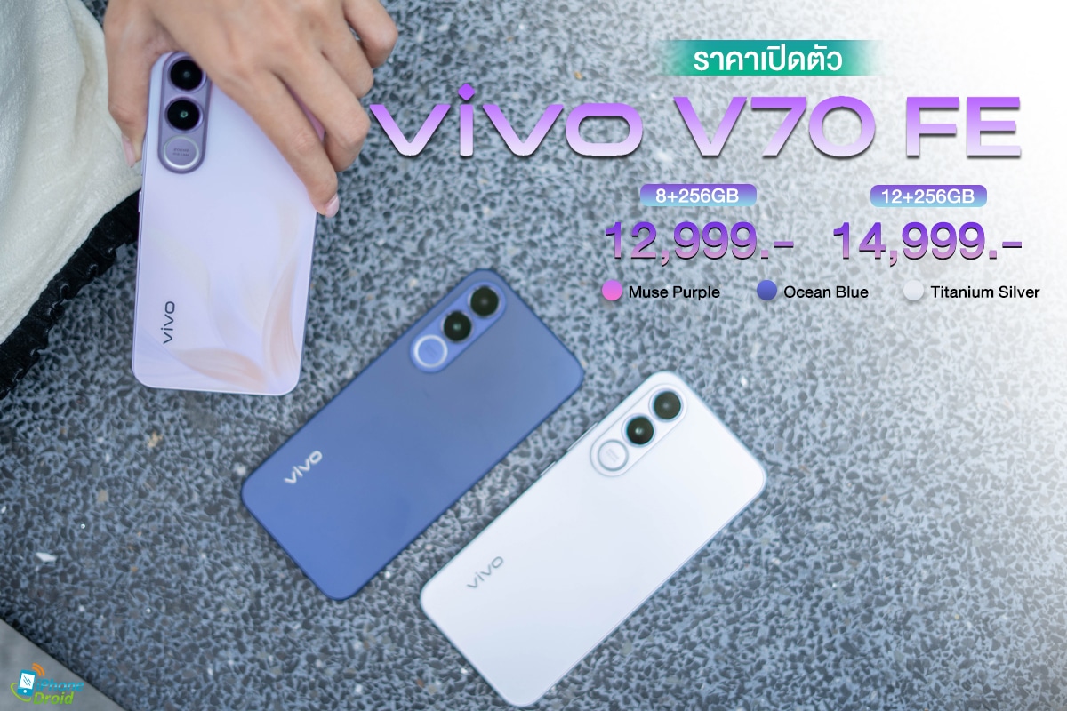 vivo V70 FE มาด้วยกันทั้งหมด 3 สี คือ สี Muse Purple, สี Ocean Blue และสี Titanium Silver โดยจะมี 2 ความจุ ดังนี้