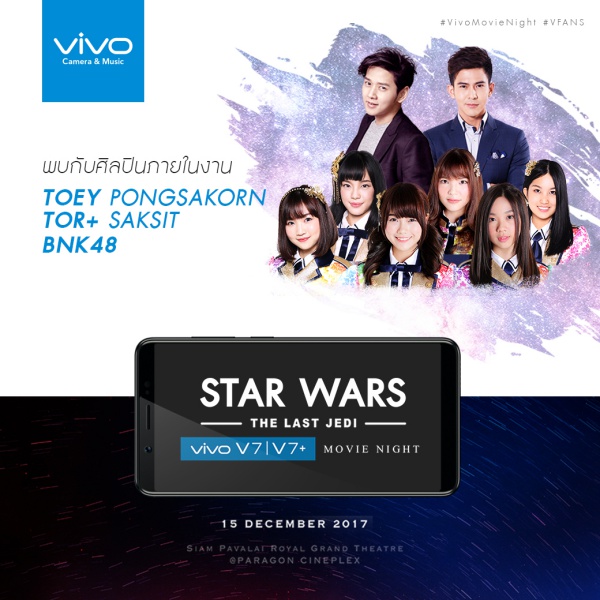 Vivo V7/V7+ Exclusive Movie Night With Star Wars The Last Jedi กิจกรรมสุดพิเศษ Vivo ชวนคุณมาชมภาพยนตร์ที่ผู้คนทั่วโลกต่างรอคอย ในค่ำคืนสุดพิเศษแบบ Exclusive กับศิลปินมากมาย พบกับมินิคอนเสิร์ตจากโต๋ ศักดิ์สิทธิ์ และศิลปินวง BNK48 ทั้ง 6 ท่าน เฌอปราง, มิวสิค, ไข่มุก, แคนแคน, ปัญ และ อร นอกนี้ยังพบกับคุณเต้ย พงศกรที่มาร่วมงานในครั้งนี้อีกด้วย พบกันในวันศุกร์ที่ 15 ธันวาคม 2560 เวลา 17.00 น.เป็นต้นไป ณ โรงภาพยนตร์ Siam Pavalai @Siam Paragon