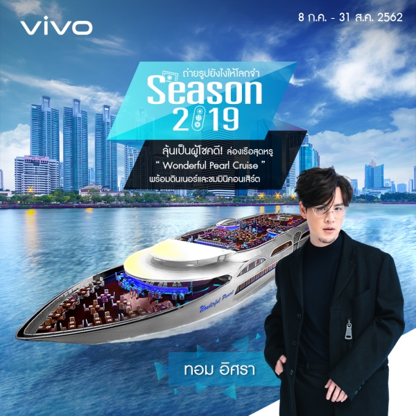 Vivo Season กลับมาอีกครั้งที่จะนำโปรโมชั่นและของแถมพิเศษมากมายมาให้แฟน Vivo และยังมีกิจกรรมดีๆ เล่นผ่านทาง Vivo Official Facebook Page เพื่อลุ้นเป็นผู้โชคดีไปร่องเรือสุดหรูและมินิคอนเสิร์ตกับ ทอม อิศรา ณ Wonderful Pearl Cruise โดยมีกติกาดังนี้.