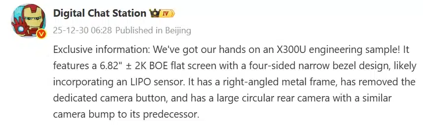 โดยข้อมูลนี้มาจาก Digital Chat Station จอมหลุดคนดัง ที่เผยว่าได้เห็นเครื่องต้นแบบของ vivo X300 Ultra แล้ว และให้รายละเอียดดีไซน์ไว้ดังนี้