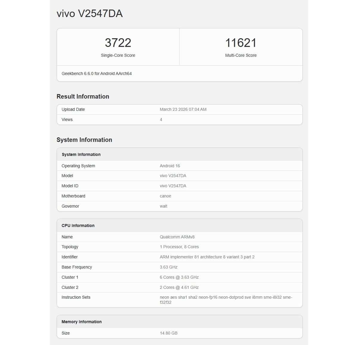 โดย vivo X300 Ultra เครื่องที่ถูกทดสอบใน Geekbench จะมีรหัสโมเดลว่า V2547DA ได้คะแนนทดสอบ Single-Core = 3722 และ Multi-Core = 11621 เรียกว่าสูงสมกับความเป็น Ultra เลย