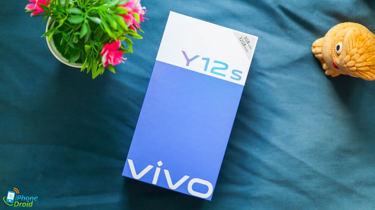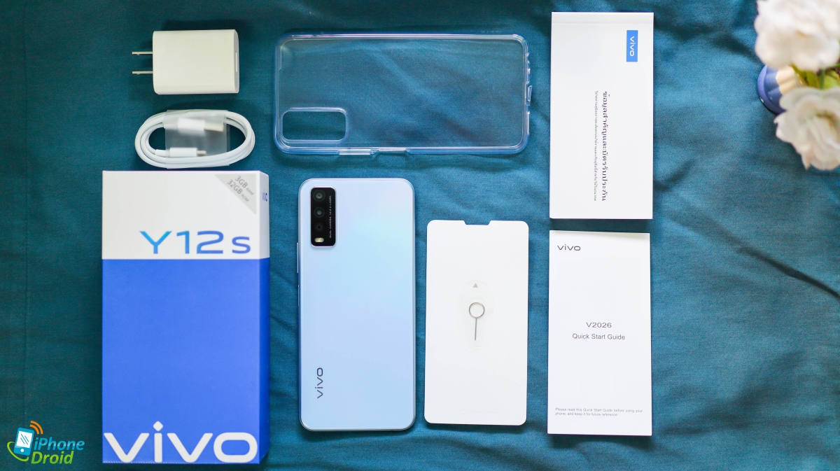 Vivo Y12s มาในกล่องตามสไตล์ของ Y Series ครับ โดยมีสีฟ้าตัดลายเส้น พร้อมชื่อแบรนด์ Vivo ด้านล่าง และด้านบนจะเป็นชื่อรุ่น Y12s พร้อมความจุที่มุมขวาบน