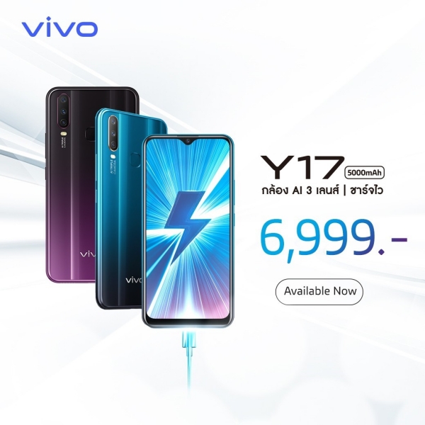 Vivo Y17 เปิดวางจำหน่ายอย่างเป็นทางการแล้ว ในวันที่ 18 พฤษภาคม 2562 นี้ โดย Vivo Y17 จัดเต็ม มาพร้อม แบตเตอรี่ขนาดใหญ่ 5000 mAh และมาพร้อมเทคโนโลยีชาร์จไว 18W Dual-Engine Fast Charging และกล้องหลัง AI Triple Camera ที่มาพร้อมเลนส์วายถ่ายภาพมุมกว้างได้ถึง 120 องศา