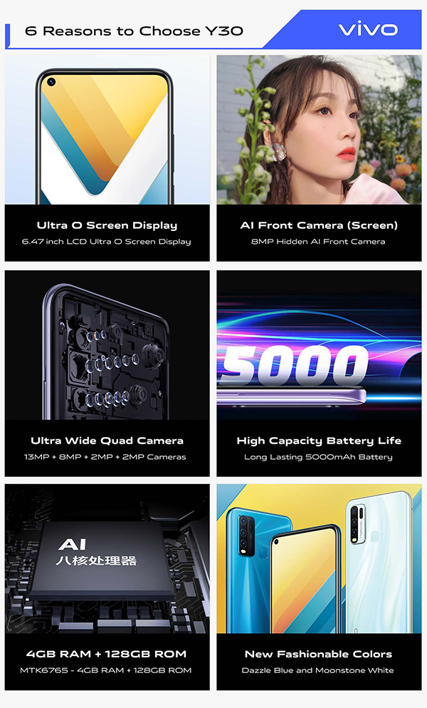 สำหรับ Vivo Y30 มีให้เลือก 2 สี ได้แก่ Moonstone White และ Dazzle Blue ในราคา 899 ริงกิต หรือประมาณ 6,700 บาท