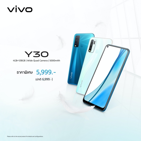 Vivo ปรับราคาน้องเล็กอย่าง Vivo Y30 ที่มาพร้อม หน้าจอแบบใหม่ Ultra O Screen ขนาด 6.47 นิ้ว  และRAM 4GB และ ROM 128GB พื้นที่จัดเก็บข้อมูลขนาดใหญ่ สามารถดาวน์โหลดแอปพลิเคชั่นต่างๆ โดยไม่จำเป็นต้องล้างข้อมูล หรือคอยลบแอปพลิเคชั่นบ่อยๆ Y30 มาพร้อมด้วยแบตเตอรี่ขนาดใหญ่ 5000mAh พร้อมให้คุณใช้งานตลอดเวลา Y30 กล้องหลังสี่ตัว ที่มาพร้อมการออกแบบอย่างมีเอกลักษณ์ กล้องหลังหลักความละเอียด 13 ล้านพิกเซล กล้องเลนส์ Super Wide-Angle 8 ล้านพิกเซล กล้องเลนส์ Macro 2 ล้านพิกเซล และกล้องเลนส์ Bokeh 2 ล้านพิกเซล ด้วยกล้องทั้งสี่ตัวนี้ทำให้คุณเป็นผู้เชี่ยวชาญด้านการถ่ายภาพ ให้คุณถ่ายภาพออกมาได้อย่างสมบูรณ์แบบ กล้องเลนส์ Super Wide-Angle ความละเอียด 8 ล้านพิกเซล ถ่ายภาพมุมกว้างได้ถึง 120 องศา เพื่อให้คุณสามารถถ่ายภาพทิวทัศน์ที่กว้างขึ้น และถ่ายภาพกลุ่มคนได้มากขึ้น กล้องเลนส์ Macro ความละเอียด 2 ล้านพิกเซล ถ่ายภาพระยะใกล้ได้ถึง 4 ซม.