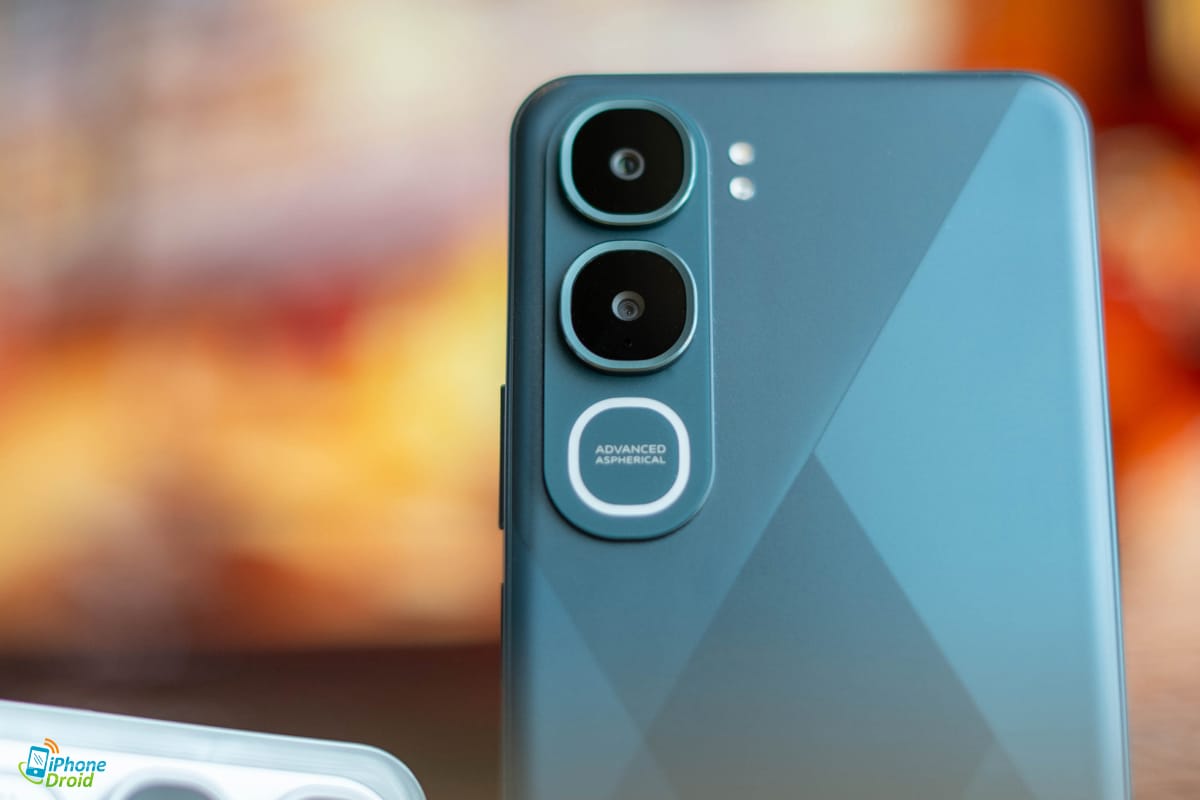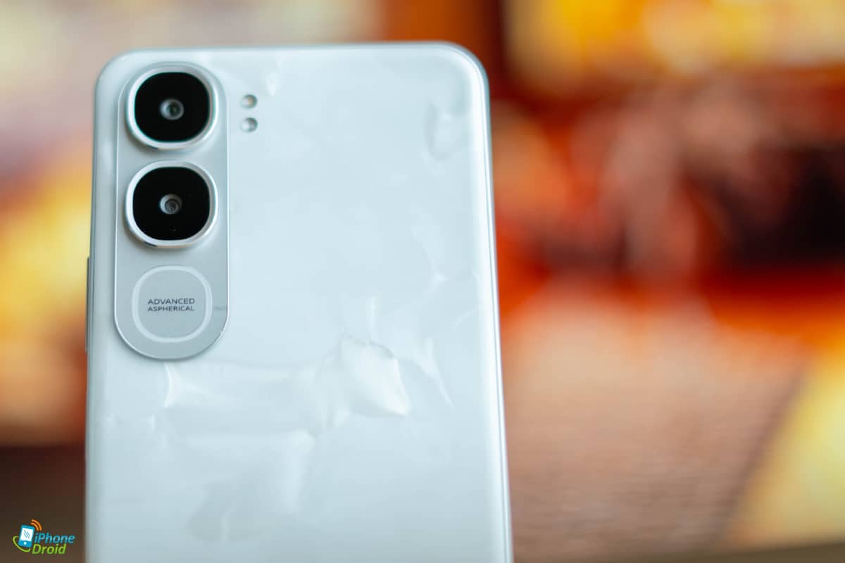ท้ายสุดท้ายด้านหลังจะมีกล้องหลังคู่ โดยมีไมโครโฟนตัวที่ 2 อยู่ในตัวกรอบเลนส์เสริม พร้อมไฟไดนามิก โดยที่ด้านนอกฝั่งขวาของโมดูลกล้องจะเป็นไฟแฟลช LED 2 ดวง