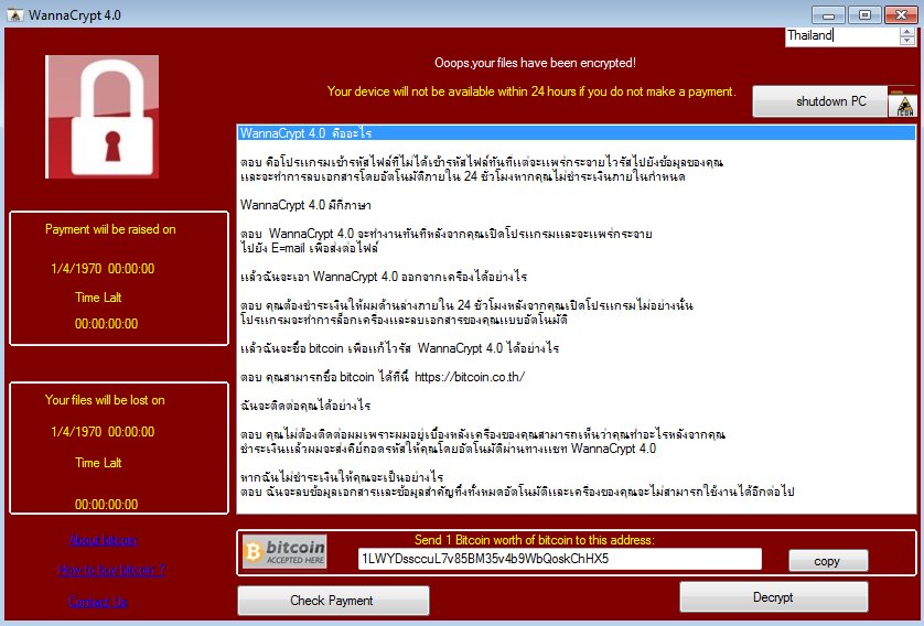 #wcrypt #wannacry #wannacrypt Thai version; screen only; no encryption yet; probably in devhttps://t.co/AVuh2IJcQp pic.twitter.com/nLV1uRsz8W