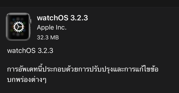 watchOS 3.2.3 การอัปเดทนี้ประกอบไปด้วยการปรุงและการแก้ไขข้อบกพร่องต่างๆ บน Apple Watch การอัปเดทเข้าไปที่ แอพ Watch > ทั่วไป > รายการอัปเดทซอต์แวร์ > ดาวน์โหลดและติดตั้ง