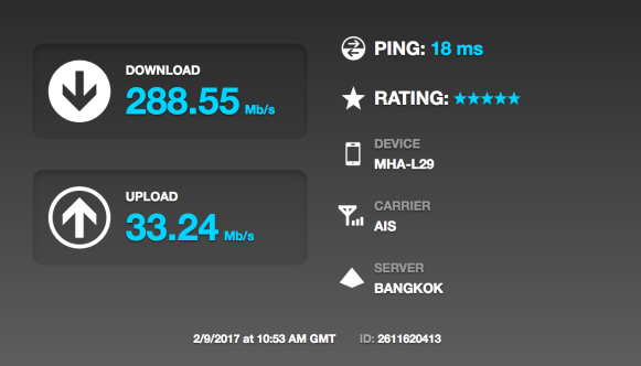 หลังจากที่ได้ทราบกันแล้วว่าทั้ง Latency และ Throughput คืออะไรมาดูการทดสอบกันครับ จากภาพนี้ทดสอบด้วยแอพ Speedtest.net กับเครือข่าย AIS 4G จะเห็นได้ว่า ความเร็ว “Throughput” ที่ได้ Download คือ 288.55 Mb/s และ Upload คือ 33.24 Mb/s และ “Latency” คือ 18ms ค่า Latency น้อยมากเท่าไหร่ การตอบสนองก็ยิ่งดีครับ (ลิงก์ตัวอย่างผลทดสอบ http://www.speedtest.net/my-result/a/2611620413)