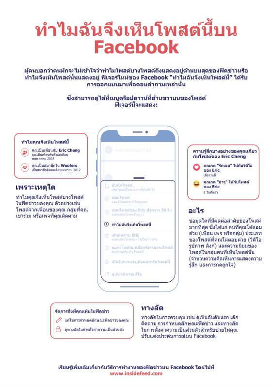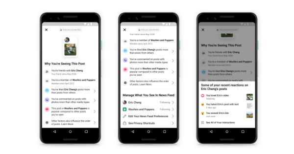 เพื่อช่วยให้ผู้คนเข้าใจและสามารถควบคุมสิ่งที่พวกเขาเห็นบนฟีดข่าวได้ง่ายยิ่งขึ้น เมื่อเร็วๆ นี้ Facebook จึงได้อัพเดทฟีเจอร์ “ทำไมฉันจึงเห็นโฆษณานี้” พร้อมแนะนำฟีเจอร์ “ทำไมฉันจึงเห็นโพสต์นี้” ซึ่งอธิบายว่าปฏิสัมพันธ์ของผู้คนส่งผลกระทบต่อการจัดอันดับโพสต์บนฟีดข่าวของพวกเขาอย่างไร โดยการอัพเดทและแนะนำฟีเจอร์ใหม่ครั้งนี้เกิดขึ้นไล่เลี่ยกับการอัพเดทการจัดอันดับเนื้อหา เมื่อไม่นานมานี้ เพื่อช่วยให้ผู้คนเชื่อมต่อกับโพสต์ที่มีความหมายมากที่สุดสำหรับพวกเขา