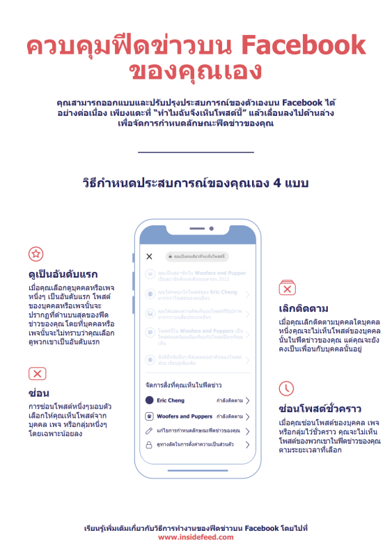 หากคุณต้องการเห็นโพสต์มากขึ้นหรือน้อยลงจากเพื่อน เพจ หรือกลุ่มแบบเฉพาะเจาะจง คุณสามารถปรับฟีดข่าวของคุณให้ตรงกับความต้องการได้ด้วยการใช้การตั้งค่าควบคุมความเป็นส่วนตัวต่างๆ เช่น ‘เห็นโพสต์ก่อน’ ‘เลิกติดตาม’ ‘ซ่อนโพสต์’ และ ‘ซ่อนโพสต์ชั่วคราว’ นอกจากนี้ ทางลัดสู่การตั้งค่าความเป็นส่วนตัวเหล่านี้ยังมีให้บริการในฟีเจอร์ “ทำไมฉันจึงเห็นโพสต์นี้” อีกด้วย