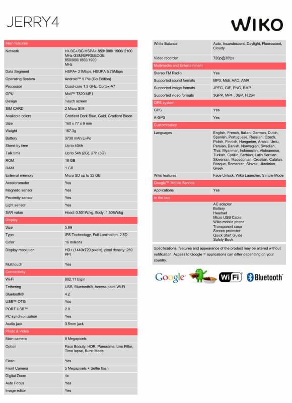 วีโก (Wiko) สมาร์ทโฟนจากฝรั่งเศสตอกย้ำคอนเซ็ปต์สมาร์ทช้อยส์ กับ Wiko JERRY4 (วีโก เจอร์รี่ 4)สมาร์ทโฟนแห่งความบันเทิง จอใหญ่เต็มตา ขนาดใหญ่ 5.99 นิ้ว ขยายความกว้างในการแสดงผลบนอัตราส่วน 18:9 พร้อมกับความละเอียดแบบ HD+ เต็มอิ่มกับลำโพงคู่หน้าสเตอริโอ ฟังเพลงหรือดูหนังยาวนานด้วยแบตเตอรี่ 3,730mAh มาพร้อมระบบปฏิบัติการแอนดรอยด์ใหม่ล่าสุด Android™ 9 Pie (Go Edition) เก็บทุกภาพความประทับใจด้วยกล้องหลัง 8 ล้านพิกเซล กล้องหน้าความละเอียด 5 ล้านพิกเซลภายในยังมีโหมดถ่ายภาพมากมาย เช่น HDR, Face beauty, Live filtersหน่วยประมวลผล Quad-Core, ROM 16GB, RAM 1GB รองรับสองซิมการ์ด 3G+3G รับประกันตัวเครื่อง 12 เดือน