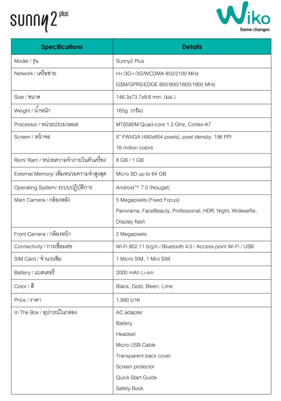 วีโก สมาร์ทโฟนจากฝรั่งเศส แนะนำ “Wiko Sunny2 Plus” มาพร้อมกับหน้าจอขนาด 5 นิ้ว สนุกกับการถ่ายภาพผ่านกล้องหลังความละเอียด 5 ล้านพิกเซล และกล้องหน้าความละเอียด 2 ล้านพิกเซล พร้อมโหมดถ่ายภาพมากมาย เช่น Professional, HDR, Wideselfie และ Display Flash แชร์และโพสผ่านเครือข่าย3G อย่างลื่นไหลด้วยระบบปฏิบัติการแอนดรอยด์ 7.0 Nougat ภายในมาพร้อมกับหน่วยประมวลผล MT6580M Quad-core 1.3 GHz, Cortex-A7, RAM 1GB, ROM 8 GB เพิ่มหน่วยความจำภายนอก MicroSD ได้ 64 GB พร้อมรองรับ 2 ซิมการ์ด พิเศษด้วยการออกแบบฝาหลังแบบเมทัลดีไซน์ มั่นใจทุกการใช้งาน มีให้เลือก 4 สี ได้แก่ Black, Gold, Bleen, Lime ในราคาเพียง 1,990 บาท หาซื้อได้ที่ตัวแทนจำหน่ายทั่วประเทศ
