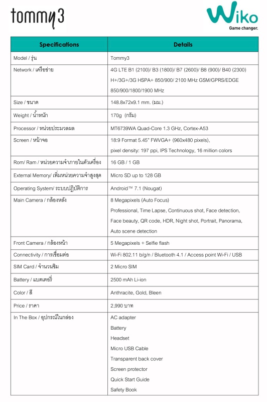 วีโก สมาร์ทโฟนจากฝรั่งเศส ส่งตรงสมาร์ทโฟนรุ่นใหม่ล่าสุด จากงาน Mobile World Congress 2018 ที่เพิ่งเปิดตัวที่เมืองบาร์เซโลนา ประเทศสเปนเมื่อปลายเดือนที่ผ่านมา กับ“Wiko Tommy3” สมาร์ทโฟนในมุมมองที่กว้างขึ้นกับหน้าจอขนาดใหญ่ 5.45 นิ้ว ในอัตราส่วน 18:9 ให้ความสว่างคมชัดด้วย IPS Technology รองรับการเชื่อมต่ออินเทอร์เน็ตผ่านเครือข่าย 4G มาพร้อมกับระบบปฏิบัติการแอนดรอยด์ 7.1 (Nougat) เก็บภาพความทรงจำของคุณ ด้วยกล้องหลังความละเอียดสูงถึง 8 ล้านพิกเซล พร้อมระบบ Auto Focus หรือเซลฟีผ่านกล้องหน้าความละเอียด 5 ล้านพิกเซล พร้อม Soft Light Selfie Flash ช่วยให้ใบหน้าสว่างเนียนอย่างเป็นธรรมชาติ ภายในยังมีโหมดถ่ายภาพอีกมากมาย เช่น Professional, Time Lapse, Continuous shot เต็มประสิทธิภาพด้วยหน่วยประมวลผล Quad-Core 1.3 GHz, Cortex-A53 ROM 16 GB, RAM 1 GB เพิ่มหน่วยความจำภายนอก MicroSD ได้ 128 GB พร้อมดีไซน์ทันสมัย มีให้เลือก 3 สีสัน ได้แก่ Anthracite, Gold, Bleen ในราคาเพียง 2,990 บาท หาซื้อได้แล้ววันนี้ที่ตัวแทนจำหน่ายทั่วประเทศ