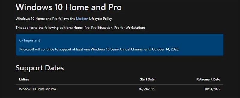 การหยุดการสนับสนุนของ Windows 10 ในเดือนตุลาคม ปี 2025 ก็เป็นการหยุดหลังจากการฉลองครบ 10 ปีในปีนั้นพอดีครับ ซึ่ง Windows 10 ในเวอร์ชันต่างๆ ไม่ว่าจะเป็น Home, Pro, Pro Education และ Pro for Workstations จะหยุดการสนับสนุนทั้งหมด