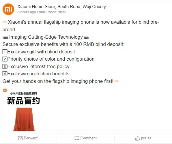 พนักงานร้านค้า Xiaomi Home ได้โพสต์ข้อความเกี่ยวกับการ “สั่งซื้อล่วงหน้าแบบคืนเงินได้” ในราคา 100 หยวน (ประมาณ 450 บาท) สำหรับสมาร์ทโฟนเรือธงรุ่นใหม่ประจำปีที่จะวางจำหน่าย ซึ่งเมื่อดูตารางของการเปิดตัวการวางขายของ Xiaomi และข้อมูลที่หลุดออกมาก็น่าจะไม่พ้น Xiaomi 17 Ultra