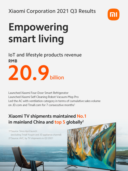 ในไตรมาสที่ 3 ของปีนี้ แม้ยอดจำหน่ายทีวีทั่วโลกจะลดลงเมื่อเทียบกับปีก่อนหน้า แต่ยอดส่งมอบสมาร์ททีวีของเสียวหมี่สูงถึง 3 ล้านเครื่อง โดยมีรายได้เพิ่มขึ้นอยู่ที่ 19.5% จากการรายงานของ All View Cloud (“AVC”) ระบุว่า ยอดส่งมอบทีวีของเสียวหมี่ในประเทศจีน ครองอันดับ 1 อย่างต่อเนื่องถึง 11 ไตรมาสติดต่อกัน และยังติดอันดับ 1 ใน 5 แบรนด์ทีวีของโลกในไตรมาสที่ 3 ของปี 2564 อีกด้วย
