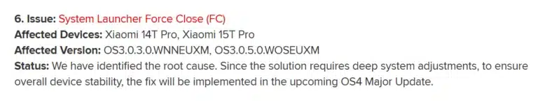 การอัปเกรด HyperOS ครั้งใหญ่ครั้งต่อไปถูกกล่าวถึงใน “ประเด็นเบอร์ 6” ของรายงานข้อบกพร่องรายสัปดาห์ล่าสุด ซึ่งเกี่ยวข้องกับปัญหาการปิดตัวลงโดยไม่คาดคิดของตัวเรียกใช้งานระบบ โดยสถานะของประเด็นดังกล่าวระบุว่า “การแก้ไขจะถูกนำไปใช้ในการอัปเดตครั้งใหญ่ OS4 ที่กำลังจะมาถึง” ซึ่งคำว่า “OS4” ในที่นี้หมายถึงการอัปเดต HyperOS 4