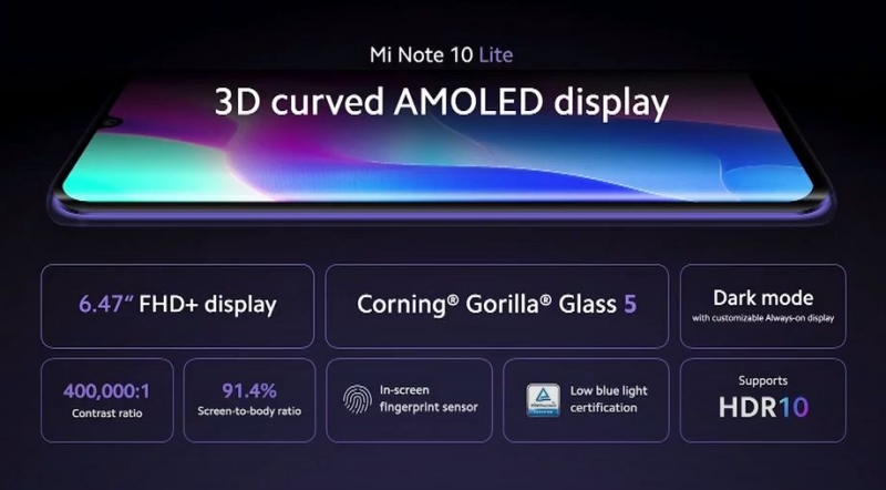 Mi Note 10 Lite มาพร้อมกับหน้าจอแสดงผลแบบโค้ง ชนิด AMOLED ขนาด 6.47 นิ้ว ความละเอียด FHD+ รองรับ HDR10 อัตราส่วน 19.5:9 มีสัดส่วนหน้าจอ 91.4%, ครอบทับด้วยกระจก Corning Gorilla Glass 5 และรองรับการสแกนลายนิ้วมือใต้หน้าจอ