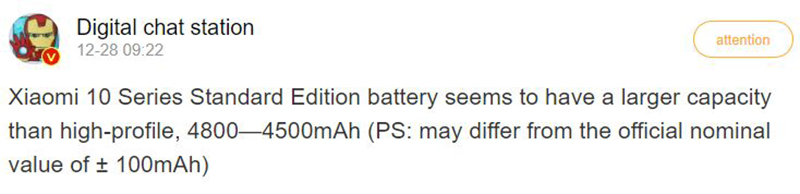 ข้อมูลดังกล่าวเผยออกมาจาก Weibo บัญชี Digital Chat Station ซึ่งเผยว่า Xiaomi Mi 10 Series จะมาพร้อมกับแบตเตอรี่ความจุอยู่ที่ 4500 – 4800mAh โดยอาจจะบวกหรือลบ 100 จากความจุดังกล่าว ทั้งนี้ ก็มีข่าวลือของ Mi 10 Pro ว่าจะมาพร้อมกับเทคโนโลยี Fast Charge ที่ 66W (11V/6A) สามารถชาร์จเต็ม 100% ได้ในเวลาเพียง 35 นาที ซึ่งใกล้เคียงกับ OPPO Reno Ace ที่ 65W ที่สามารถชาร์จเต็ม 100% ในเวลา 28 นาทีกับแบตเตอรี่ 4000mAh