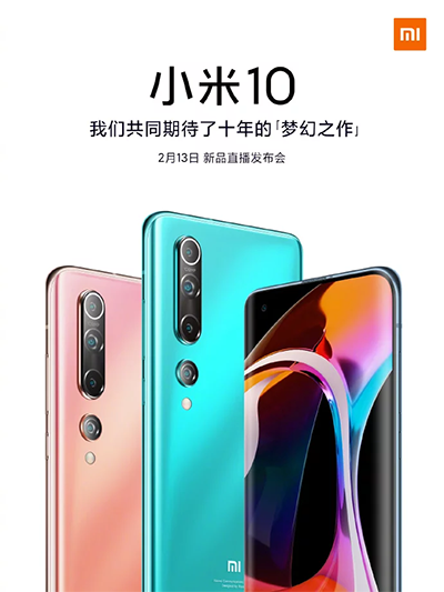 สำหรับ Xiaomi Mi 10 จะมาพร้อมกับหน่วยประมวลผล Snapdragon 865 รองรับ 5G, RAM 12/16GB LPDDR5 + ROM แบบ UFS 3.0 รองรับ Wi-Fi 6 (802.11ax) โดยจะเปิดตัวในวันที่ 13 กุมภาพันธ์นี้ทางออนไลน์ และ Global ในวันที่ 23 กุมภาพันธ์นี้ ที่งาน MWC 2020