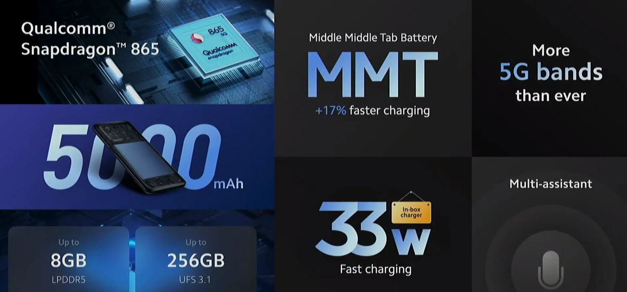 ภายในขับเคลื่อนด้วยหน่วยประมวลผล Snapdragon 865 มีโมเด็ม X55 เพื่อรองรับ 5G ควบคู่กับ RAM LPDDR5 8GB + ROM 128/256GB ชนิด UFS 3.1 มีแบตเตอรี่ 5000mAh รองรับ Fast Charge 33W