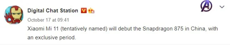 มีหลุดออกมาเรียบร้อยสำหรับสมาร์ทโฟนรุ่นแรกในประเทศจีนที่จะได้ใช้งาน CPU เรือธงปีหน้าอย่าง Snapdragon 875 หลังจากที่ Digital Chat Station จอมหลุดบน Weibo ได้เผยว่า Xiaomi Mi 11 จะเป็นรุ่นแรกที่ได้ใช้ครับ