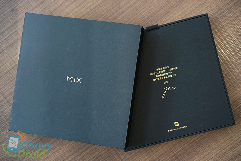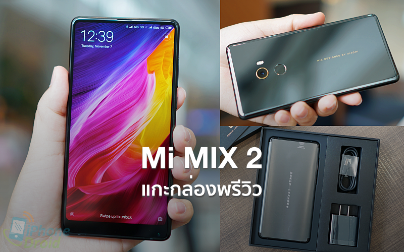 Xiaomi Mi MIX 2 มาในกล่องสีดำ โดยรุ่นที่นำมาแกะกล่องพรีวิวในครั้งนี้เป็นเครื่องนอกจากจีน รุ่นมาตรฐานแรม 6GB ความจุตัวเครื่อง 128GB ใช้ชิปเซ็ต Snapdragon 835 และเป็นตัวเครื่องเซรามิกสีดำมันเงา ซึ่งฝากล่องจะมีคำว่า MIX สีทอง เมื่อเปิดกล่องเข้าไปก็จะมีแผ่นกระดาษที่มีข้อความภาษาจีนจากคุณ Lei Jun (雷军) Founder และ CEO ของ Xiaomi