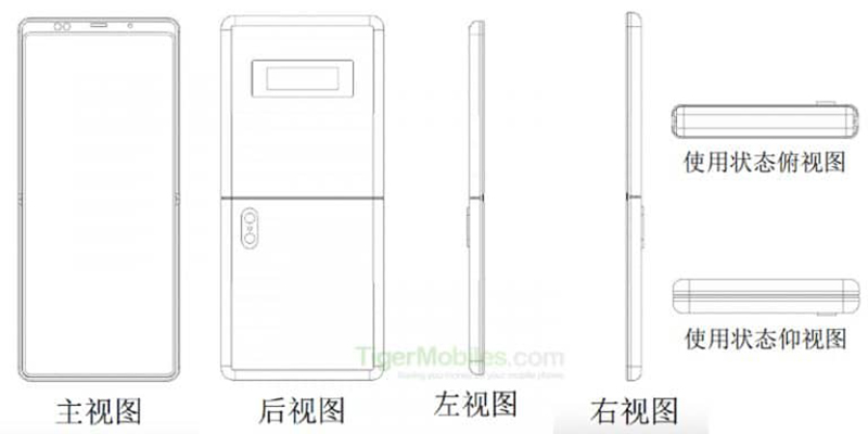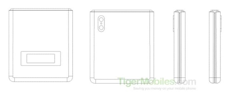 สิทธิบัตรดังกล่าวต้องย้อนกลับไปถึงเดือนสิงหาคมปี 2018 แต่เพิ่งถูกเปิดเผยออกมาได้ไม่นาน โดยภาพเผยให้เห็นถึงหน้าจอแสดงผลขนาดเล็กที่อยู่ด้านบนเมื่อถูกพับ โดยน่าจะแสดงเป็นเวลา, การโทร และการแจ้งเตือนต่างๆ ส่วนครึ่งล่างจะมีกล้องหลัง 2 เลนส์ในแนวตั้งที่ดูเหมือนจะอยู่ผิดตำแหน่งไปเสียหน่อย และเมื่อกางออกมาก็จะพบกับหน้าจอแสดงผล ที่ไม่มีรอยบากหรือติ่งอะไรอยู่ ซึ่งทำการฝังกล้องหน้า ลำโพงสนทนาและเซ็นเซอร์ต่างๆ ลงไป