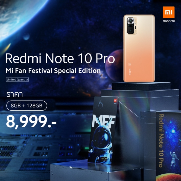 Redmi Note 10 Pro Mi Fan Festival Special Edition พร้อมวางจำหน่ายให้แก่ Mi Fan ชาวไทย โดยมาในสี Gradient Bronze ขนาดความจุ RAM 8GB + ROM 128 GB ในราคา 8,999 บาท วางจำหน่ายที่ช่องทางออนไลน์, Mi store และร้านค้าที่ร่วมรายการ