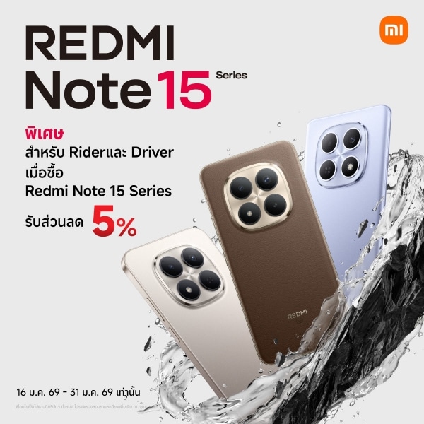 เสียวหมี่ ประเทศไทย ขอส่งต่อความแข็งแกร่งระดับไททัน แก่ผู้ให้บริการ Grab / LINE MAN / Bolt (Rider & Driver) ทุกท่านในการทำหน้าที่ส่งต่อความสุขในทุกสภาวะอากาศและสถานการณ์ด้วย REDMI Note 15 Series ที่มาพร้อมความทนทานต่อแรงกระแทกถึง 2.5 เมตร ผ่านการรับรองกันน้ำ 24 ชม. ที่ความลึก 2 เมตร โดยมอบส่วนลดทันที 5% เมื่อซื้อ REDMI Note 15 Series ทุกรุ่นตั้งแต่วันนี้ – 31 มกราคม 2569 ที่ Xiaomi Store หรือที่เว็บไซต์ www.mi.com/th เพียงกดรับโค้ดส่วนลดในแอปพลิเคชันของผู้ให้บริการของตนเอง แล้วมาแสดงหน้าร้านหรือกรอกลงในเว็บไซต์ก่อนขั้นตอนการชำระเงิน