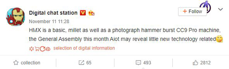 จอมหลุดในฝั่งประเทศจีนอย่าง @Digital Chat Station บน Weibo ระบุว่า Xiaomi กำลังพัฒนากล้องที่มีความสามารถมากกว่า Mi CC9 Pro อยู่ แต่เขาก็ยังไม่ได้เปิดเผยรายละเอียดอะไรออกมาเลยแม้แต่น้อย