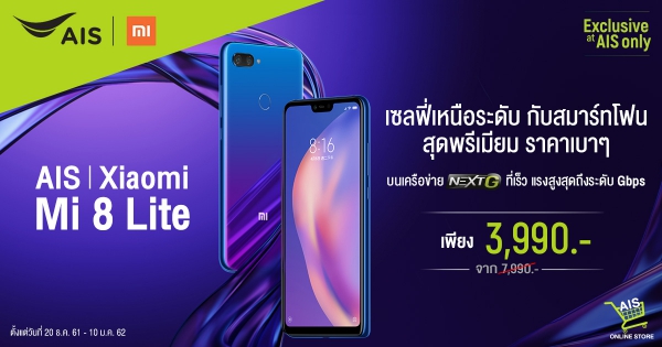 ผู้นำเทคโนโลยีระดับโลก เสียวหมี่ (Xiaomi) ร่วมเป็นเอ็กซ์คลูซีฟพาร์ทเนอร์ กับ เอไอเอส ผู้นำเครือข่ายและบริการดิจิทัล จับมือส่งมอบโปรโมชั่นพิเศษส่งท้ายปีจาก Xiaomi Mi 8 Lite 64 GB พร้อมสัมผัสประสบการณ์ความเร็ว แรง ระดับกิกะบิต บนเครือข่าย AIS NEXT G