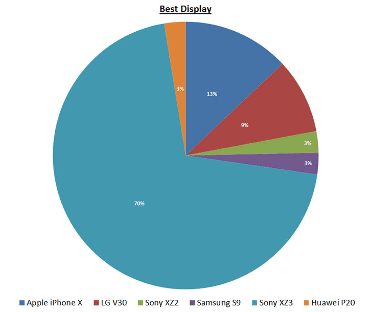 ผลการทดสอบก็พบว่าผู้ใช้งานต่างให้คะแนน Sony Xperia XZ3 มีการแสดงผลผ่านหน้าจอได้ดีที่สุด ซึ่งผลออกมาว่า Sony Xperia XZ3 ได้คะแนน 70% รองลงมาเป็น iPhone X ได้คะแนน 13% และ LG V30 ได้คะแนน 9%