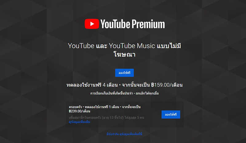 สำหรับค่าบริการรายเดือนต่อคนจะอยู่ที่ 159 บาทต่อเดือนสำหรับ Android ส่วน iOS จะมีราคาอยู่ที่ 209 บาทต่อเดือน แต่หากเป็นครอบครัว (สูงสุด 5 คน) จะมีราคาอยู่ที่ 239 บาทต่อเดือน (Android) และ 309 ต่อเดือน (iOS) โดยในสมาร์ทโฟนจะเปิดให้ทดลองได้ฟรี 1 เดือนเต็ม ส่วนบนเว็บไซต์จะกดลองได้นานถึง 4 เดือนครับ ใครที่สนใจสามารถเข้าไปที่ลิงค์นี้ได้เลย : https://www.youtube.com/premium