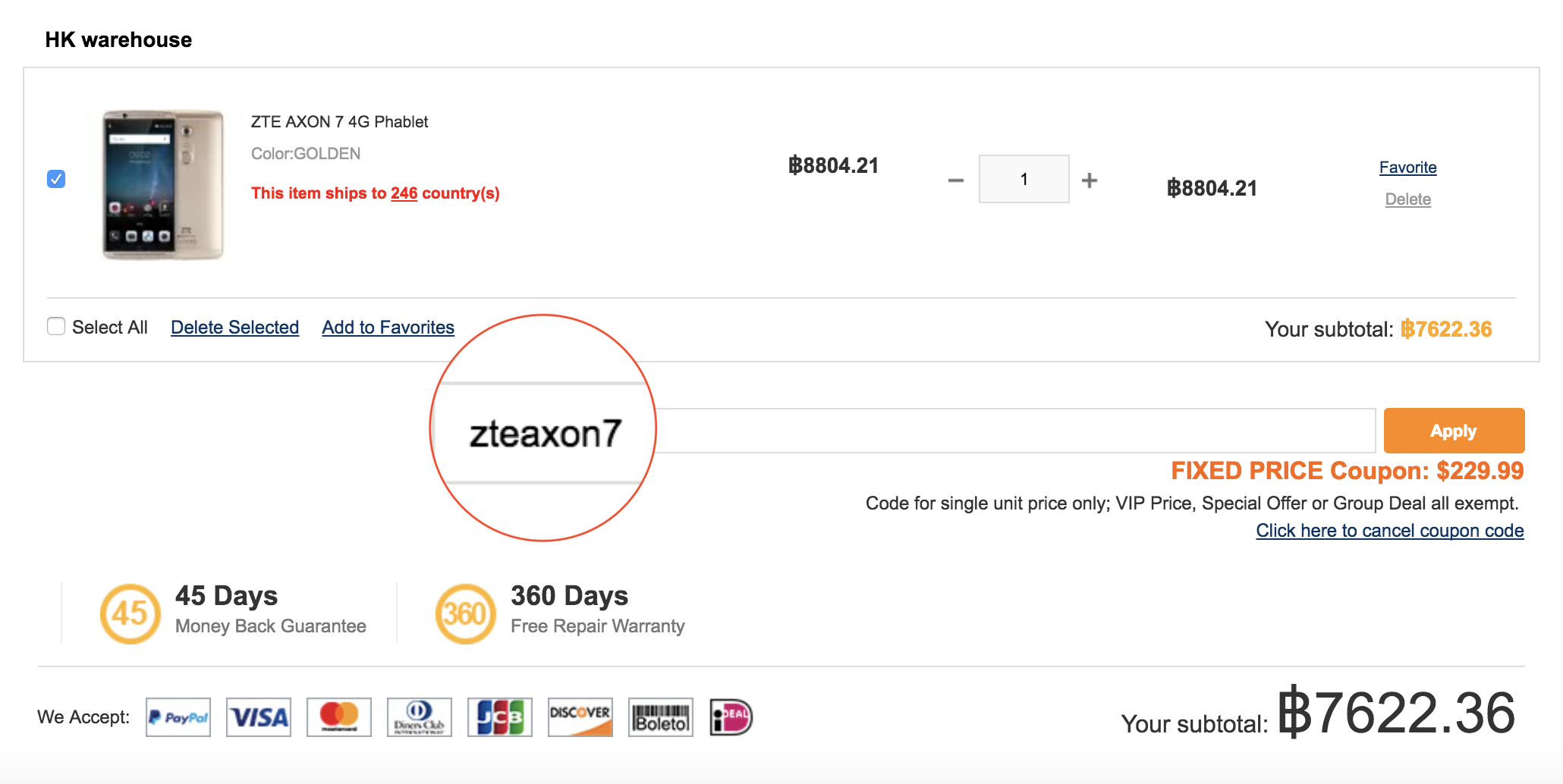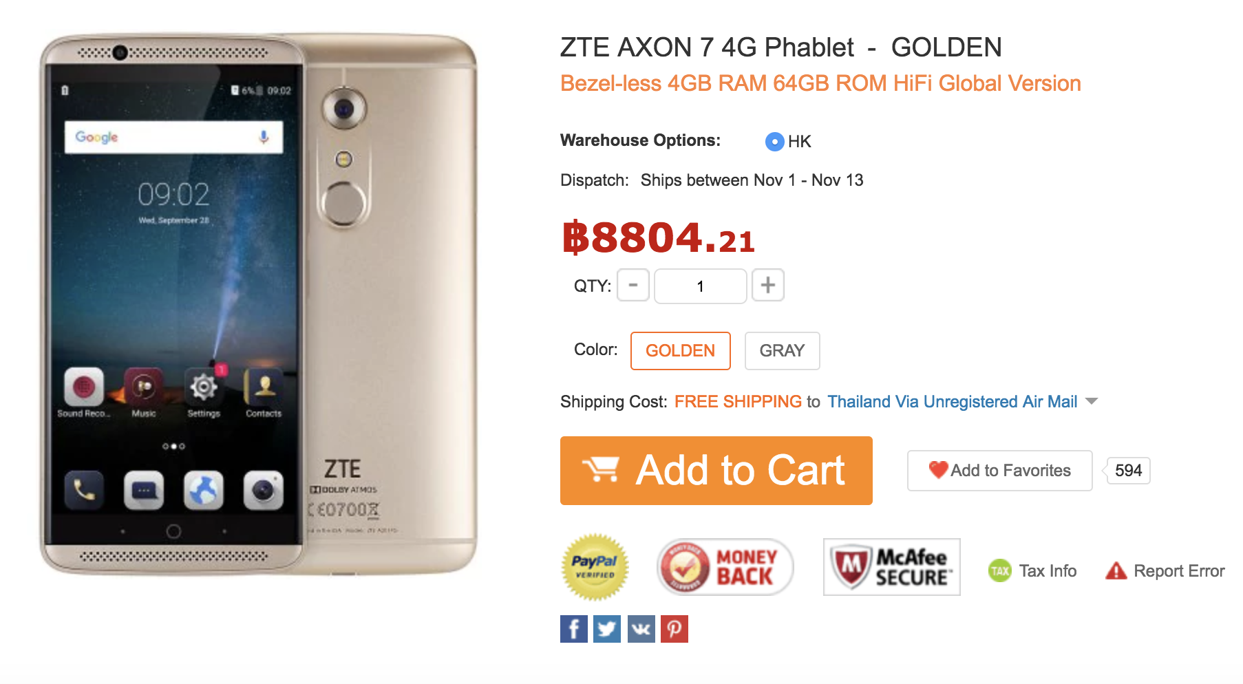 ZTE Axon 7 เป็นสมาร์ทโฟนเรือธงที่เคยประกาศเปิดตัวในไทยอย่างเป็นทางการไปเมื่อปีนี้ จากนั้นก็หายเงียบไปเลย (ตอนนั้นเปิดราคาในไทย 15,990 บาท) แต่สำหรับแฟนๆ ZTE ที่สนใจรุ่นดังกล่าวก็สามารถหาซื้อตามช่องทางร้านค้าออนไลน์ต่างๆ ได้ ซึ่งล่าสุดไปเห็นว่าบนเว็บไซต์ GearBest ร้านค้าปลีกออนไลน์ชื่อดังวางขายรุ่นนี้ในราคาประมาณ 8,804 บาท และมีโค้ดส่วนลดด้วย ‘zteaxon7‘ (อย่าลืมใส่โค้ดนี้ตอนสั่งซื้อด้วยนะ) ทำให้สามารถซื้อรุ่นนี้ในราคาเพียง 7,622 บาท (ตามค่าเงินบาทในวันนี้) ถือว่าถูกมากๆ เมื่อเทียบกับสเปคที่ได้